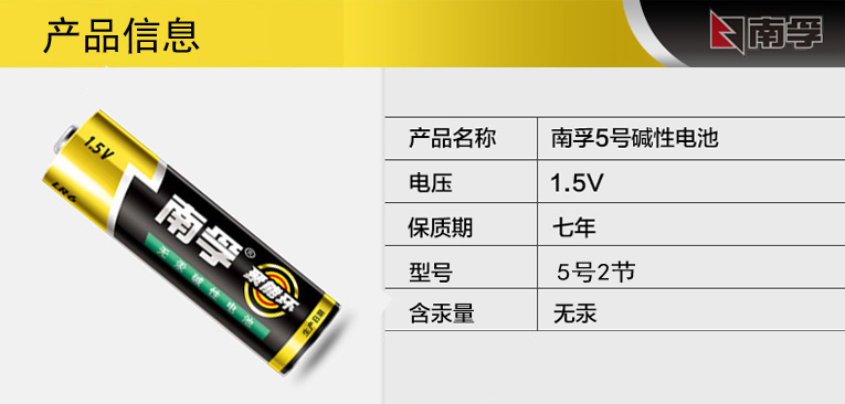 品牌:南孚 型号:5号/7号 类型:碱性电池 电压:1.5V 包装:2粒/卡,60粒/盒