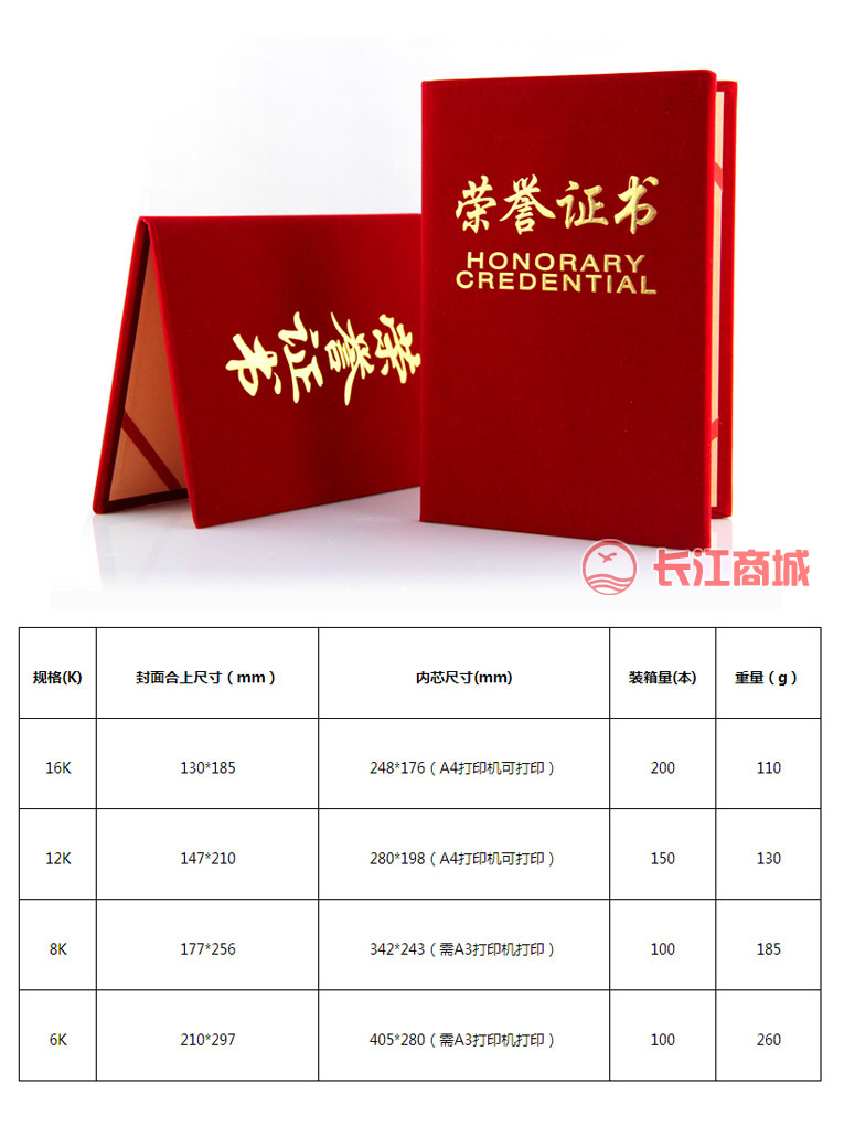 品名:荣誉证书 (行内也) 封面材质:绒面 规格:6k、8k、12k、16k