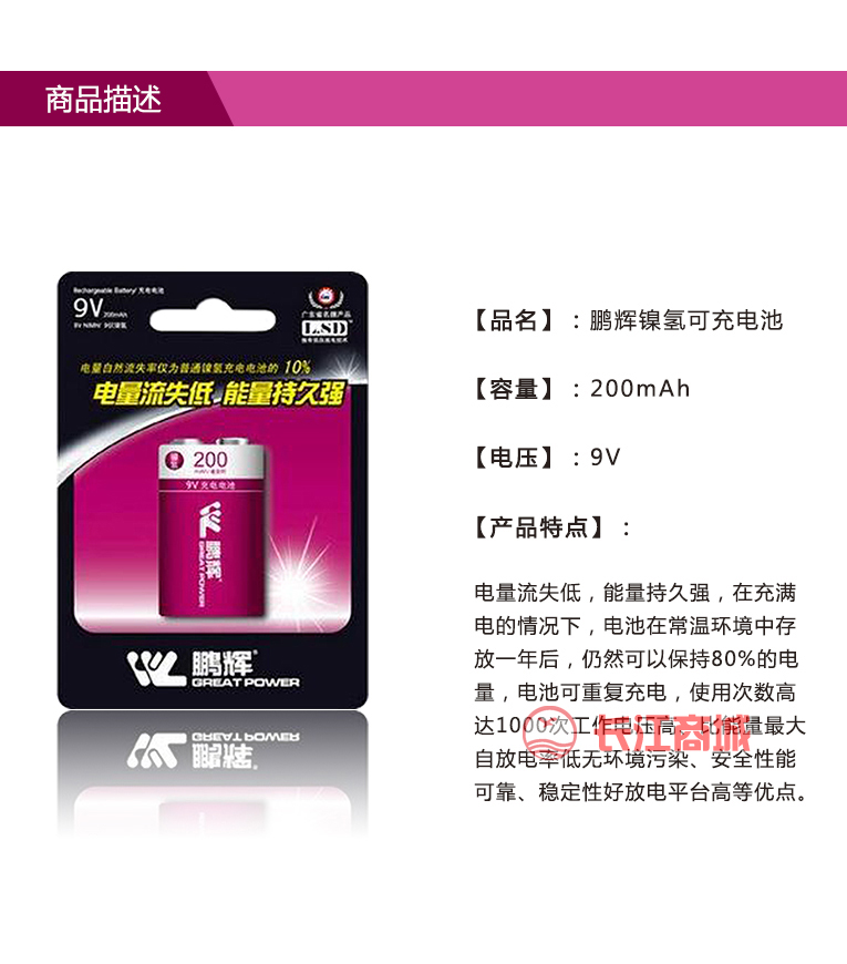 :鹏辉 电压:9v 类型:充电电池 容量:200毫安