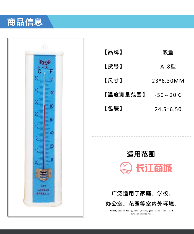 :双鱼 型号:A-8 类别:温度计 尺寸:23*6.3mm