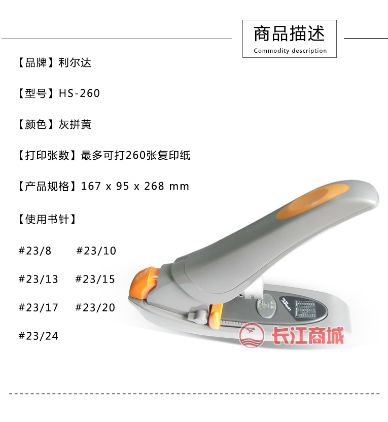 品牌:利尔达 型号:HS-260 类型:特厚重型订书机 产品规格:167*95*268mm