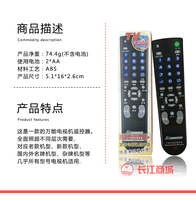 品牌:众合 型号:RM33 c+ 类别:万能遥控器 尺寸:5.1*2.6*16cm 材质:ABS