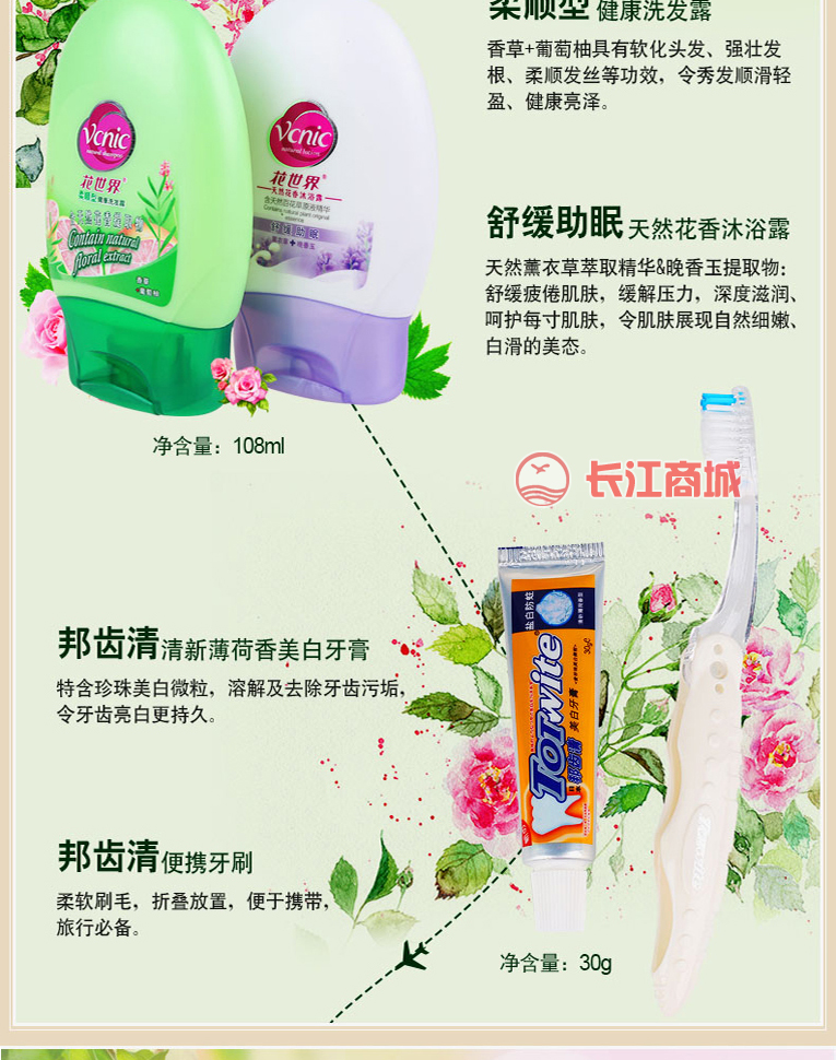 品牌:花世界 型号:花世界舒缓助眠沐浴露+柔顺型洗发露+清新薄荷香型牙膏+牙刷1支
