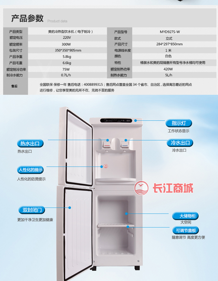 品牌:美的 颜色:927 额定电压:220v 类型:立温饮水机 颜色:白色 毛重:6.6kg