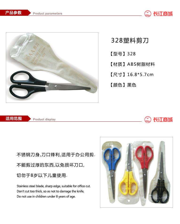 型号:328 类别:塑柄剪刀 尺寸:16.8*5.7cm 材质:ABS树脂材料