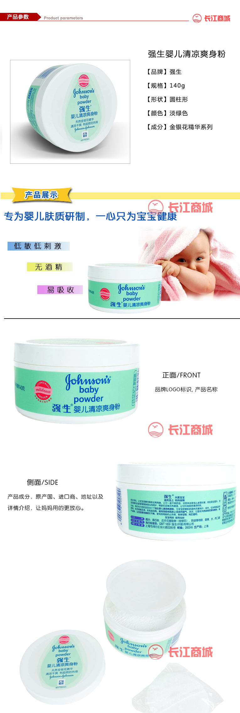 品牌:强生 规格:140g 型号:金银花精华系列 成分:滑石粉,金银花