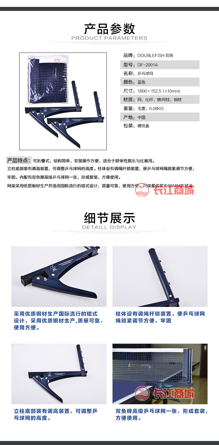 品牌:双鱼 型号:DF-2100A 类别:兵乓球网 尺寸:1800*15.2mm 颜色:蓝色