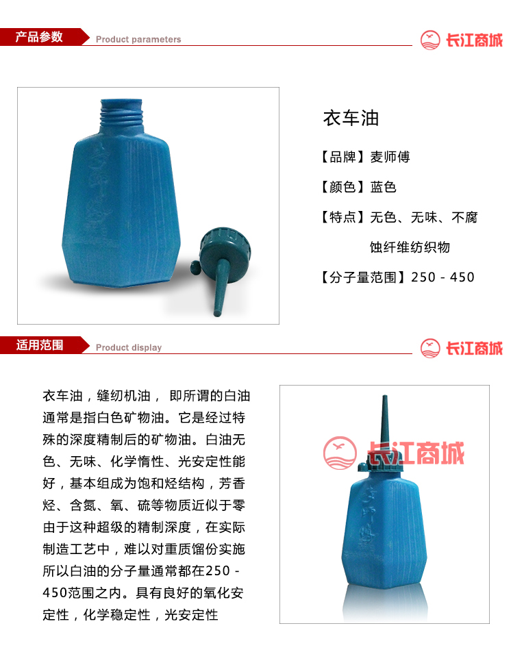品牌:麦师傅 类别:衣车油 颜色:蓝色 分子范围:250-400