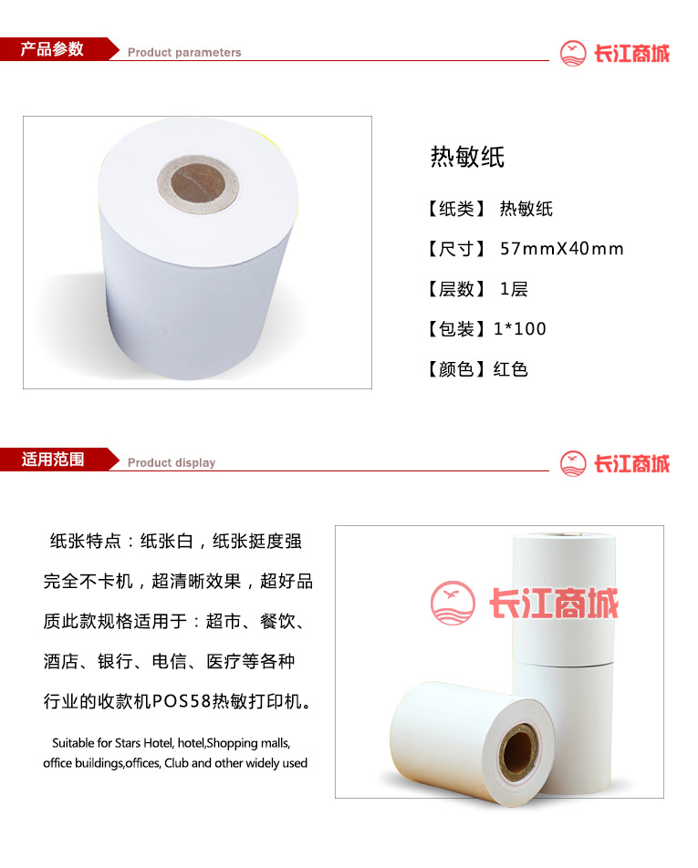 品名:热敏打印纸 尺寸:57x50mm 规格:1*160/箱