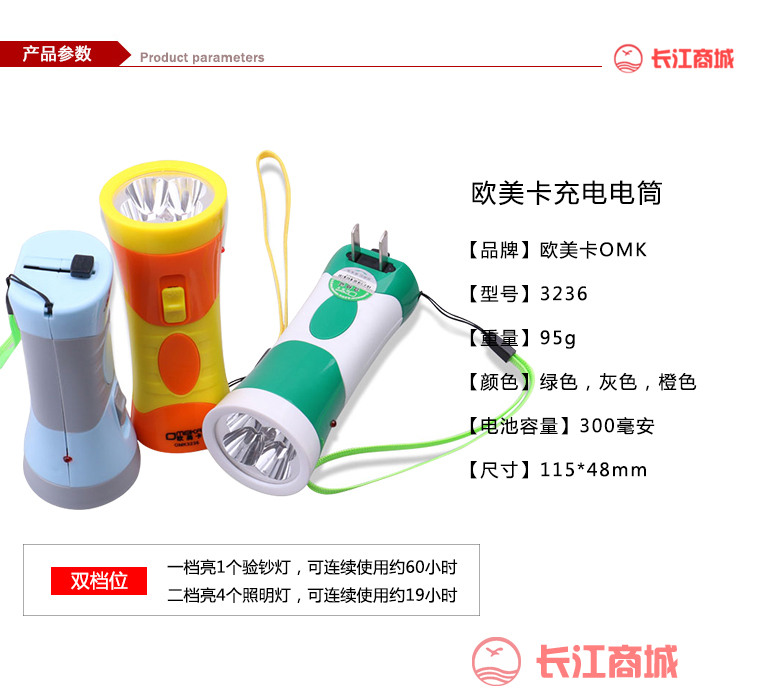 品牌:欧美卡 品名:充电电筒 型号:3226 颜色:绿色 / 灰色 / 橙色