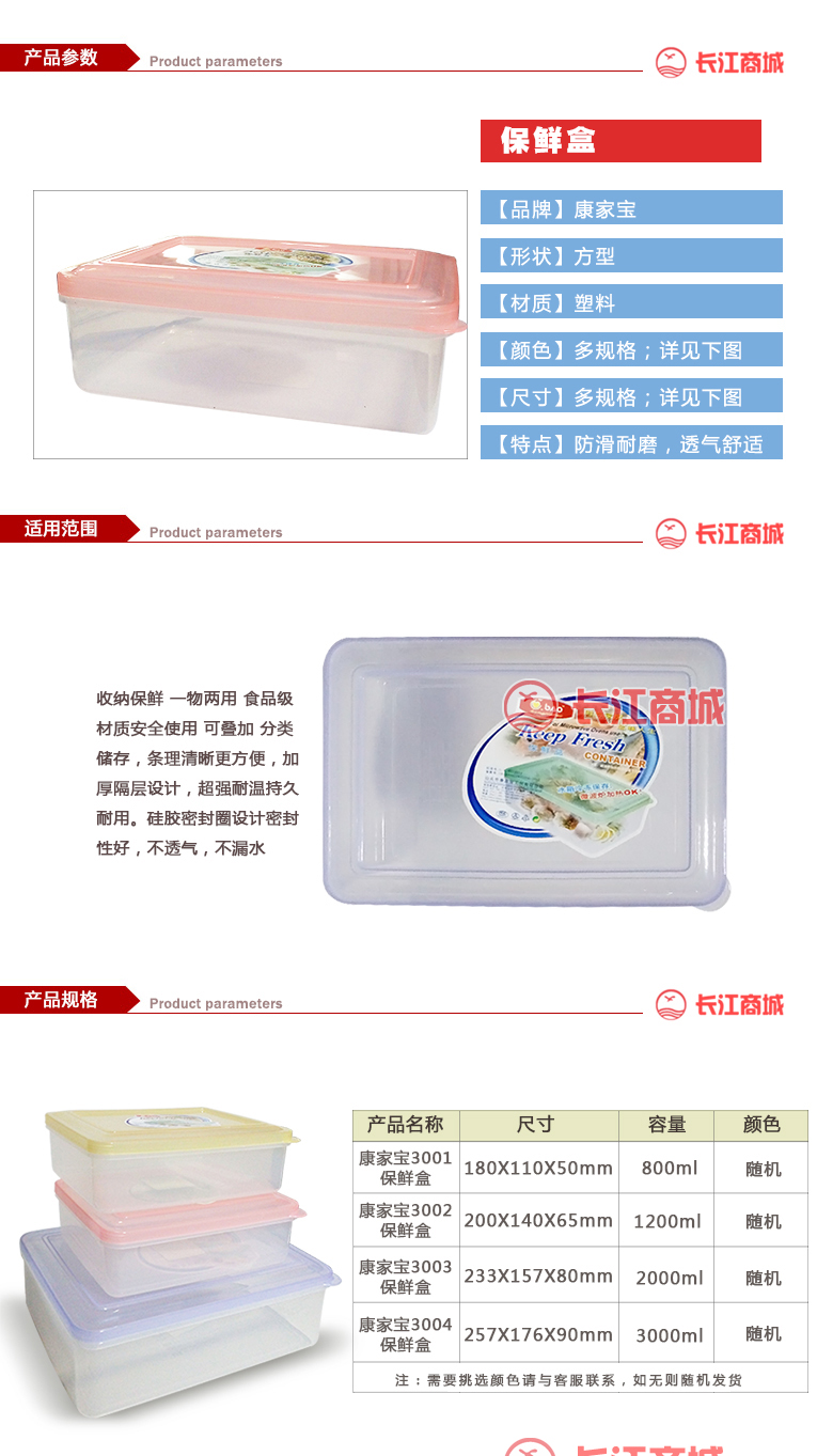 品牌:康家宝 品名:保鲜盒 规格:3301 / 3302 / 3303 /3304 容量:800ml / 1200ml / 2000ml / 3000ml
