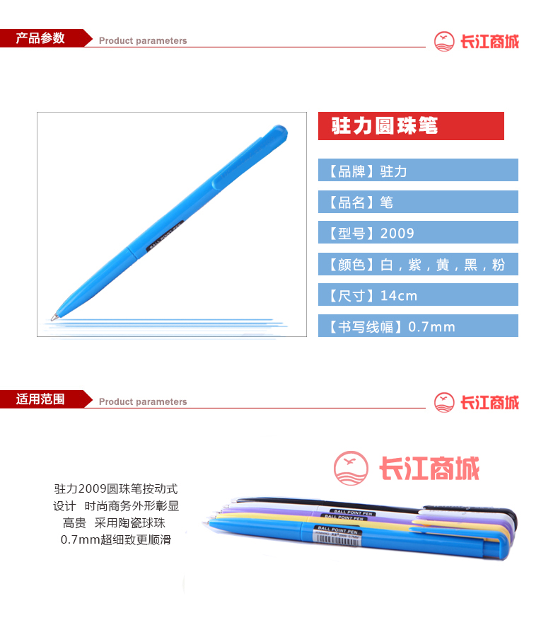 品牌:驻力 品名:圆珠笔 型号:2009 颜色:白 / 紫 / 黄 / 黑 / 粉