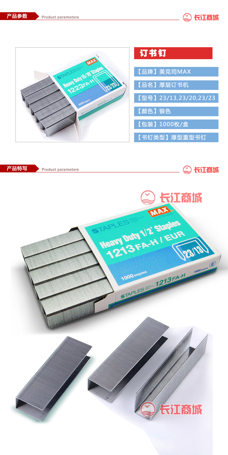 品牌:美克司MAX 品名:书钉 型号:23/13 23/20 23/23 规格:1000枚/盒