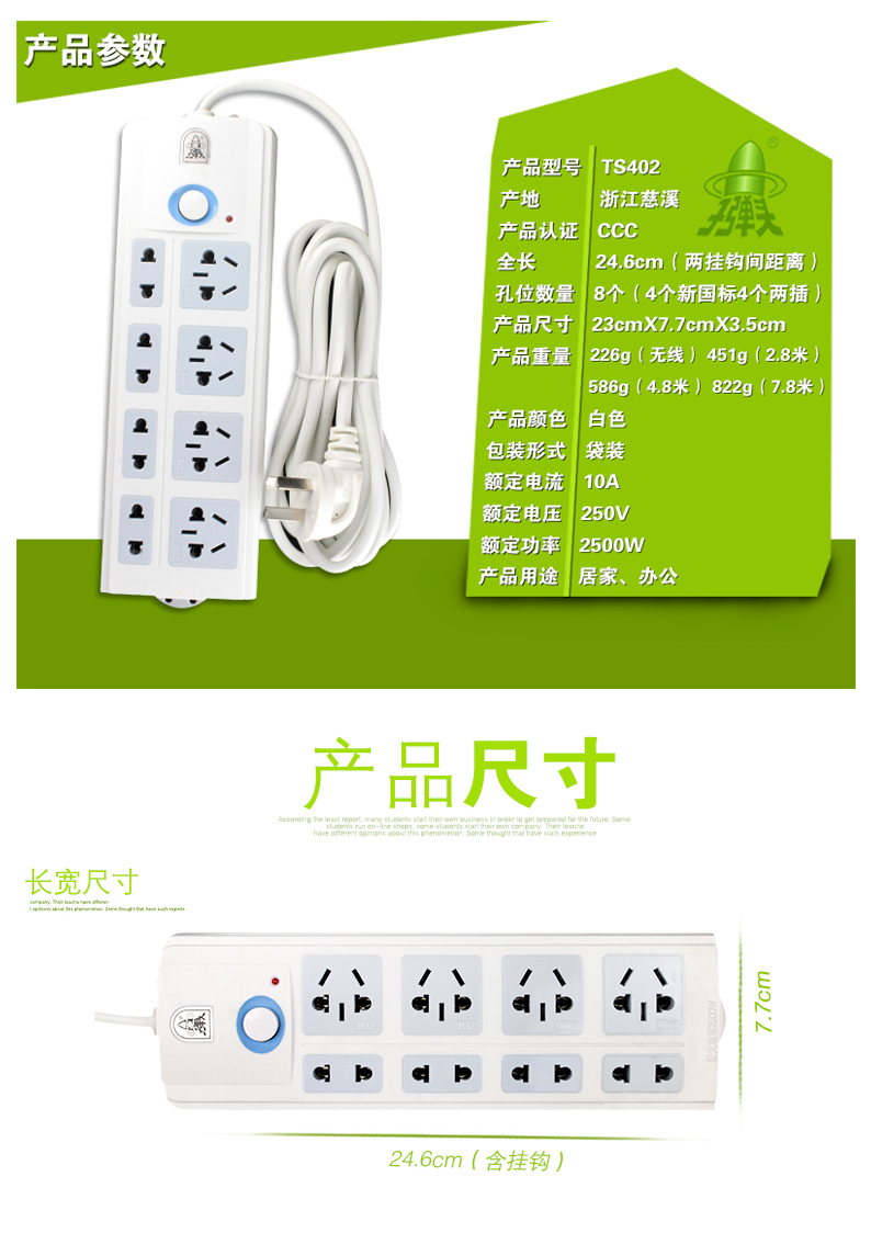 品牌:子弹头 型号:TS-402 品名:多用插座 插座位数:8位