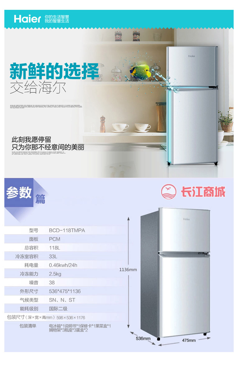 品牌:Haier/海尔 型号:BCD-118TMPA 冷冻室容积:33L 冷藏室容积:85L 净重:33kg