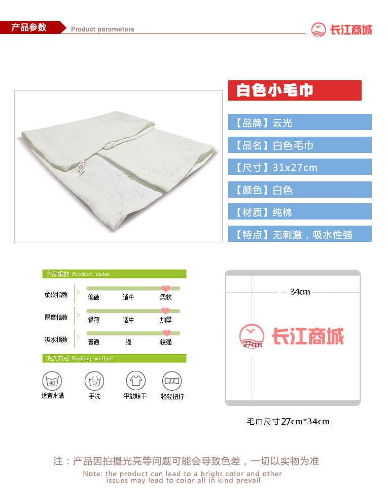 品牌:云光 品名:毛巾 颜色:白色纯色 尺寸:31x27cm