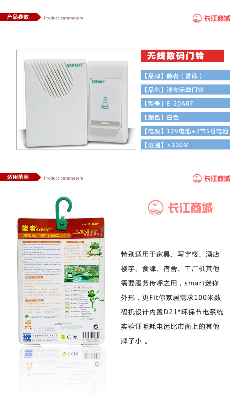 品牌:能者 品名:无线数码门铃 型号:E-20A07 产地:香港