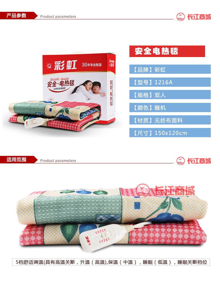 品牌:彩虹 品名:安全电热毯 规格:150x120cm 材质:无纺布面料