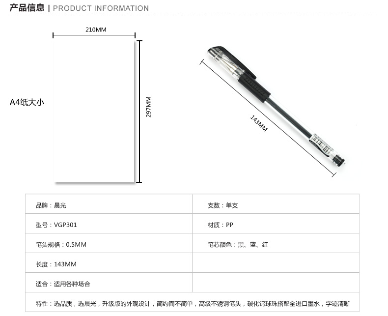 品牌:晨光 型号:VGP301 品名:中性笔 书写粗细:0.5mm 是否可擦:否