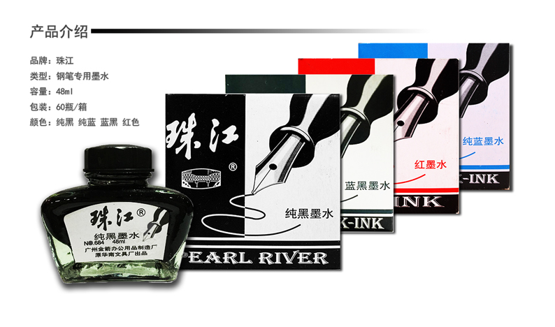 品牌:珠江 类型:钢笔专用墨水 容量:48ml 包装:60瓶/箱 颜色:纯黑 / 蓝黑 / 纯蓝 / 红色
