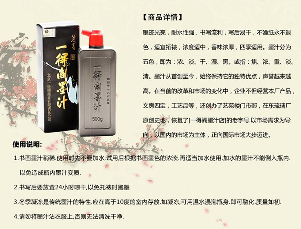 品牌:一得阁 品名:书画墨汁 重量:500g 浓度: 高浓 包装:塑料瓶身+专业纸盒包装