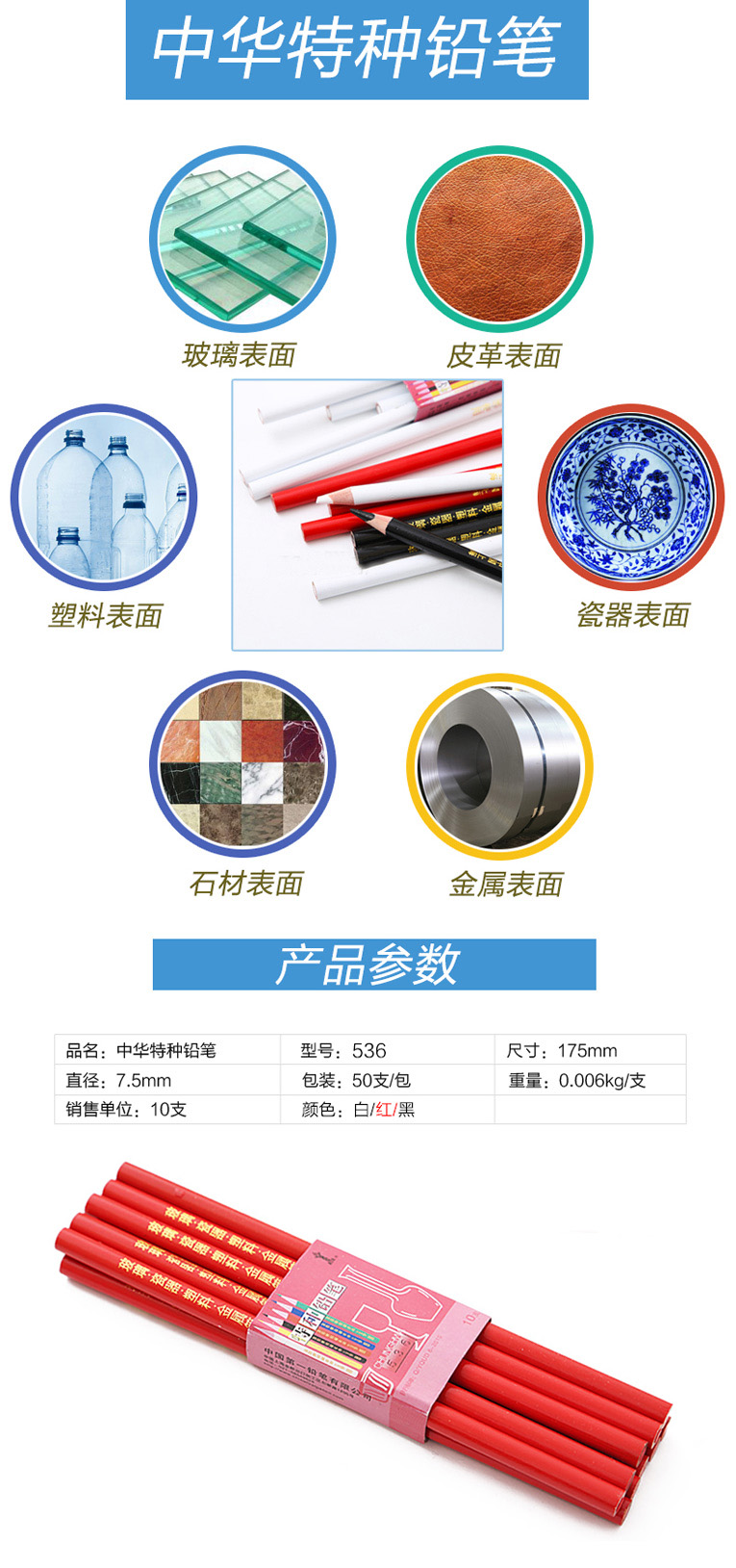 品牌:中华牌 分类:特种铅笔 颜色:红色 型号:536 包装:10支/扎