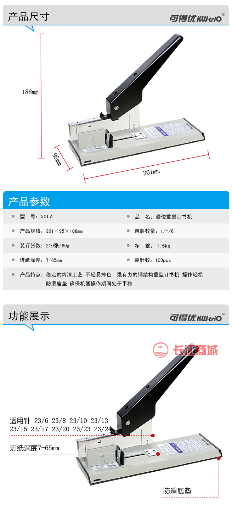 品牌:KW-TRIO/可得优 货号:50LA 类型:重型订书机 钉纸厚度:210页/20mm