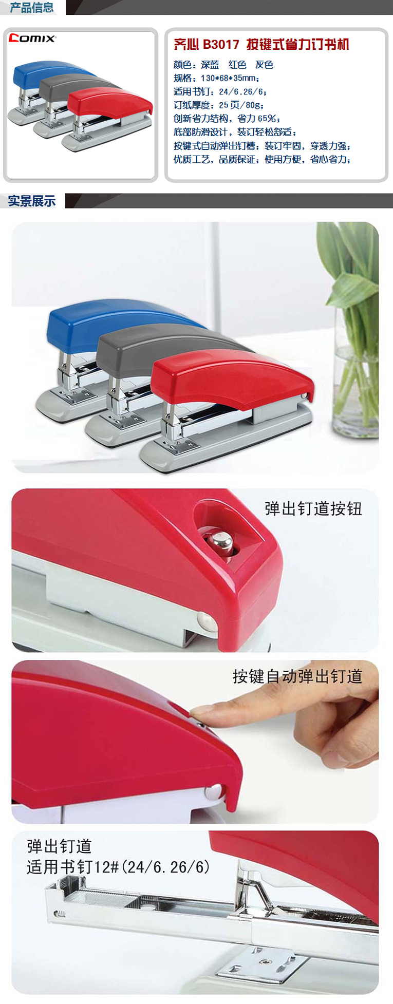 品牌:Comix/齐心 类型:中型省力订书机 型号: B3017 颜色分类:色号随机
