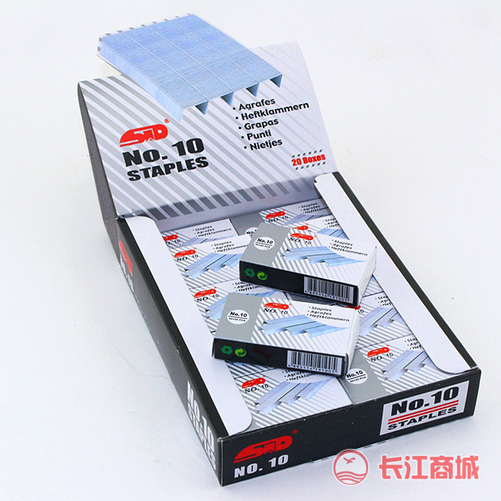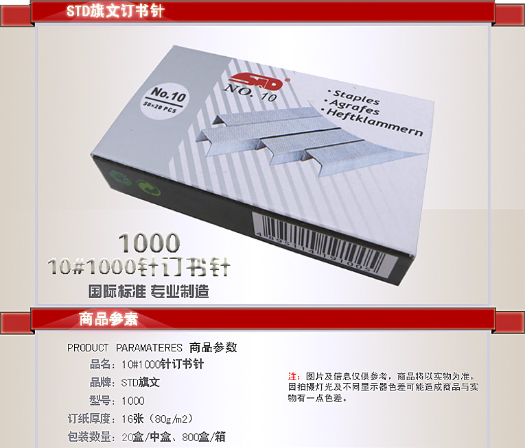 品牌:旗文 型号:1000/10号 分类:订书钉 装订厚度:16张 包装:50*20PC/小盒;20小盒/大盒