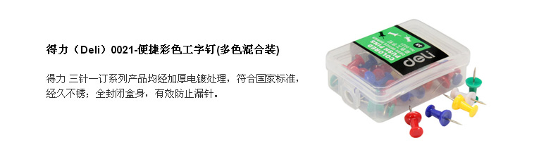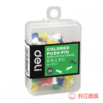 品牌:deli/得力 型号:0021 类型:工字钉/图钉 规格:约35枚/盒 颜色:彩色 包装:10小盒/大盒