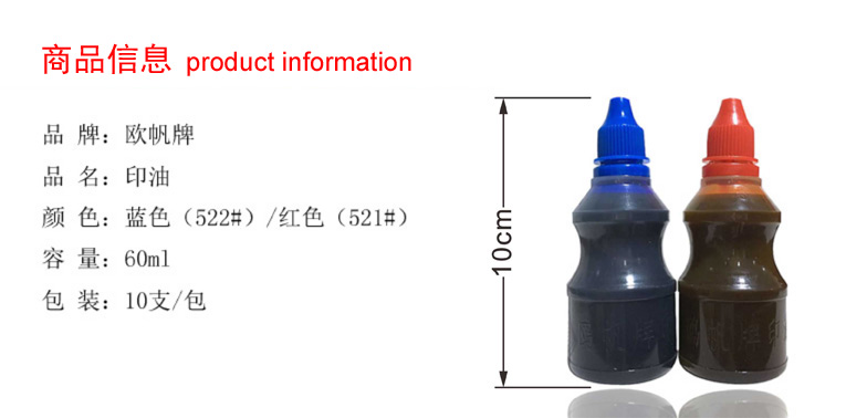 品牌: 鸥帆 型号:521#/522# 品名:印油 颜色: 红/蓝 规格:60ml 包装:10支/盒
