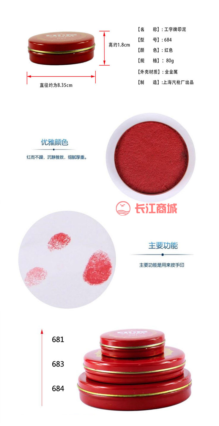 品牌:工字牌 型号:684 种类:印泥(泥巴状) 颜色:红色 包装:10个/盒 净含量:80克