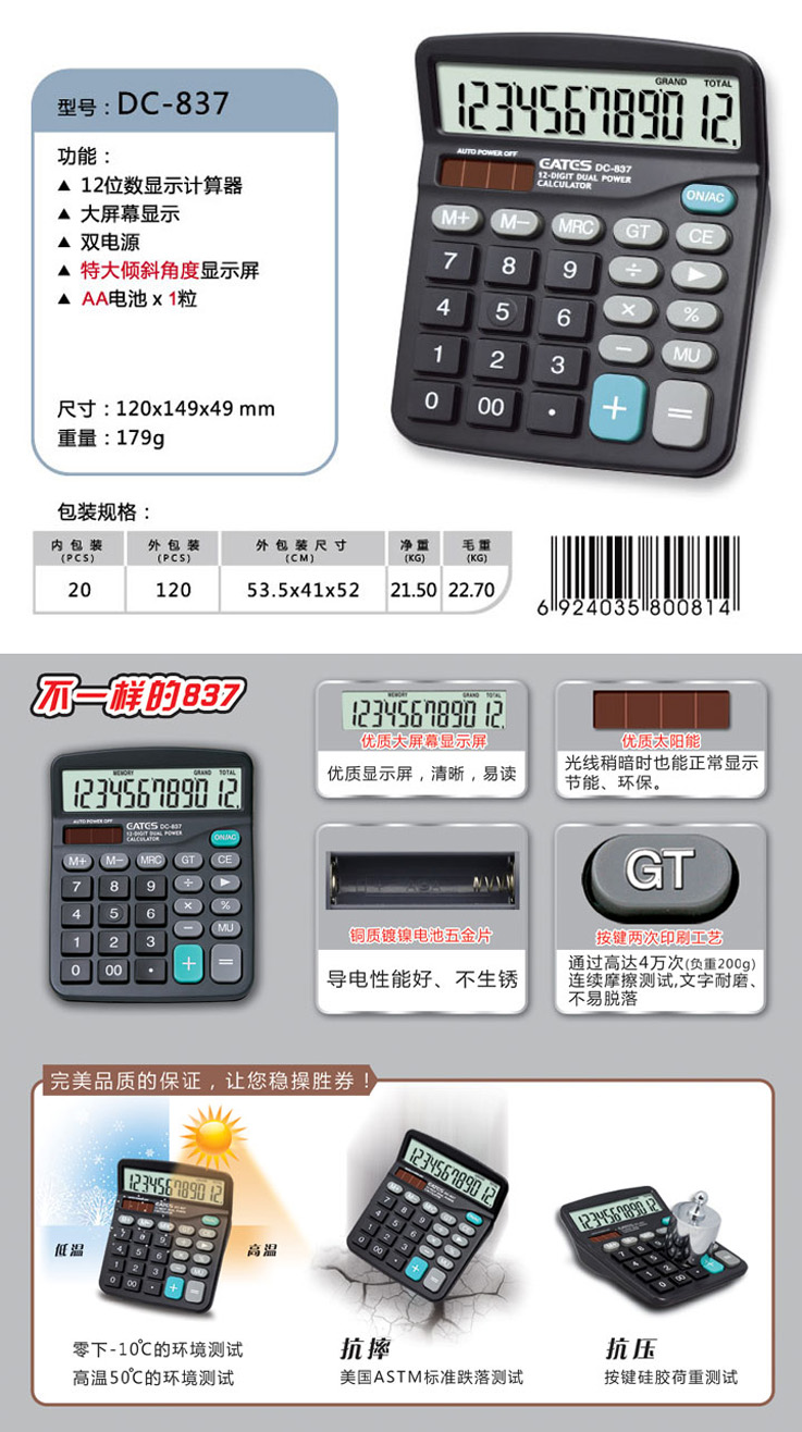 品牌:EATES/伊达时 型号:DC-837 系列:计算机/计算器 最大显示位数:12位数 类型:太阳能型