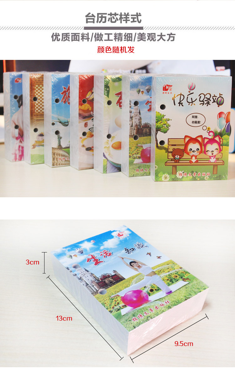 品名:64K台历芯 尺寸:13长*9.4宽*3cm厚 重量:约0.3KG/本 孔距:约3.8cm 图案:随机