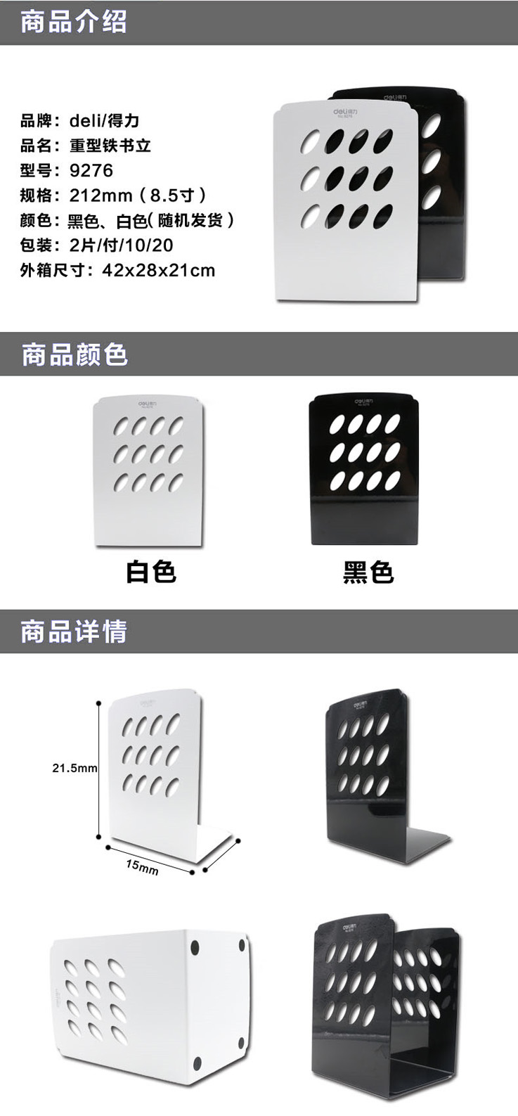 品牌:Deli/得力 型号: 9276 类型:书立 颜色分类: 灰白色/黑色 (随机) 材质:不锈钢