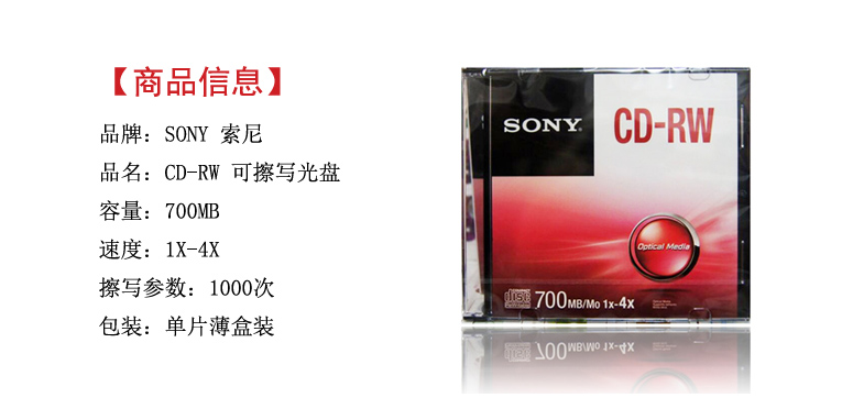 品牌:Sony/索尼 系列:可擦写系列 CD-RW 容量:700MB 包装:1片/盒 速度:1X-4X