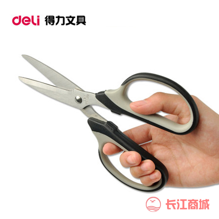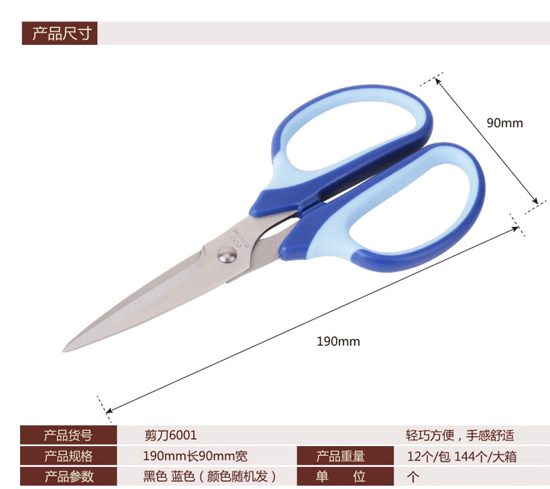 品牌:Deli/得力 型号:6001 类型:办公剪刀 颜色:黑 蓝(随机) 包装:12把 / 盒