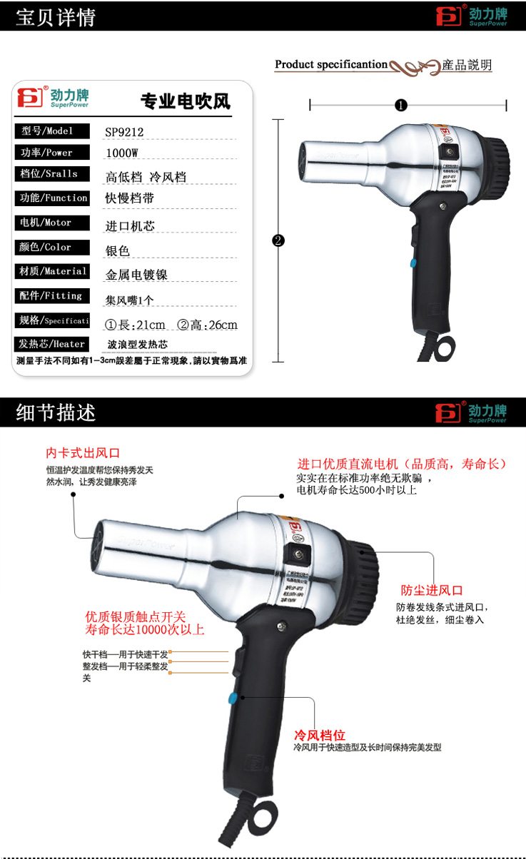 品牌: 劲力 型号: 9212 类型:电吹风/风筒 功率: 1000W-1200W 档位:2档
