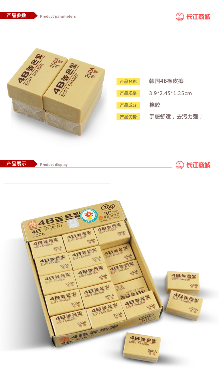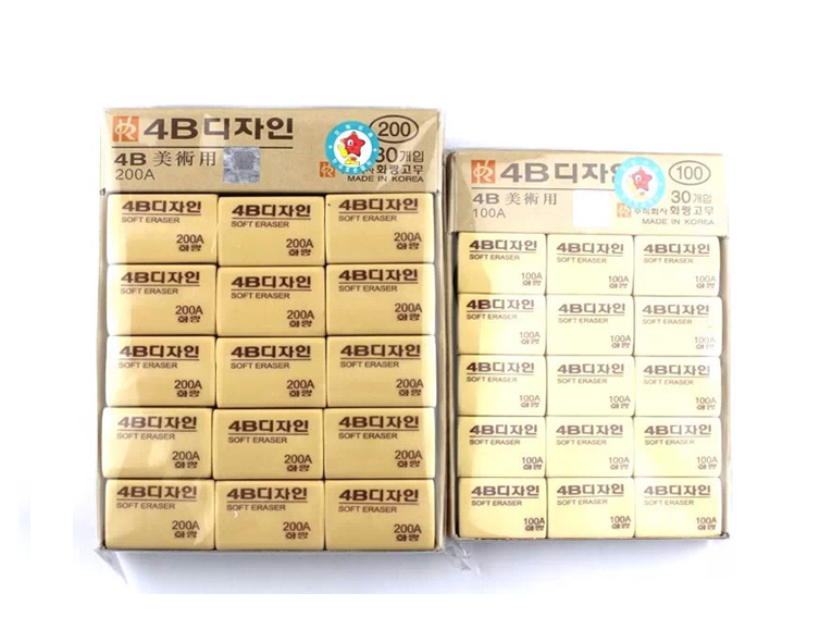 品牌:南韩 品名:4B橡皮擦/胶擦 型号:200A/100A 包装:30块/盒 重量:0.02kg/块