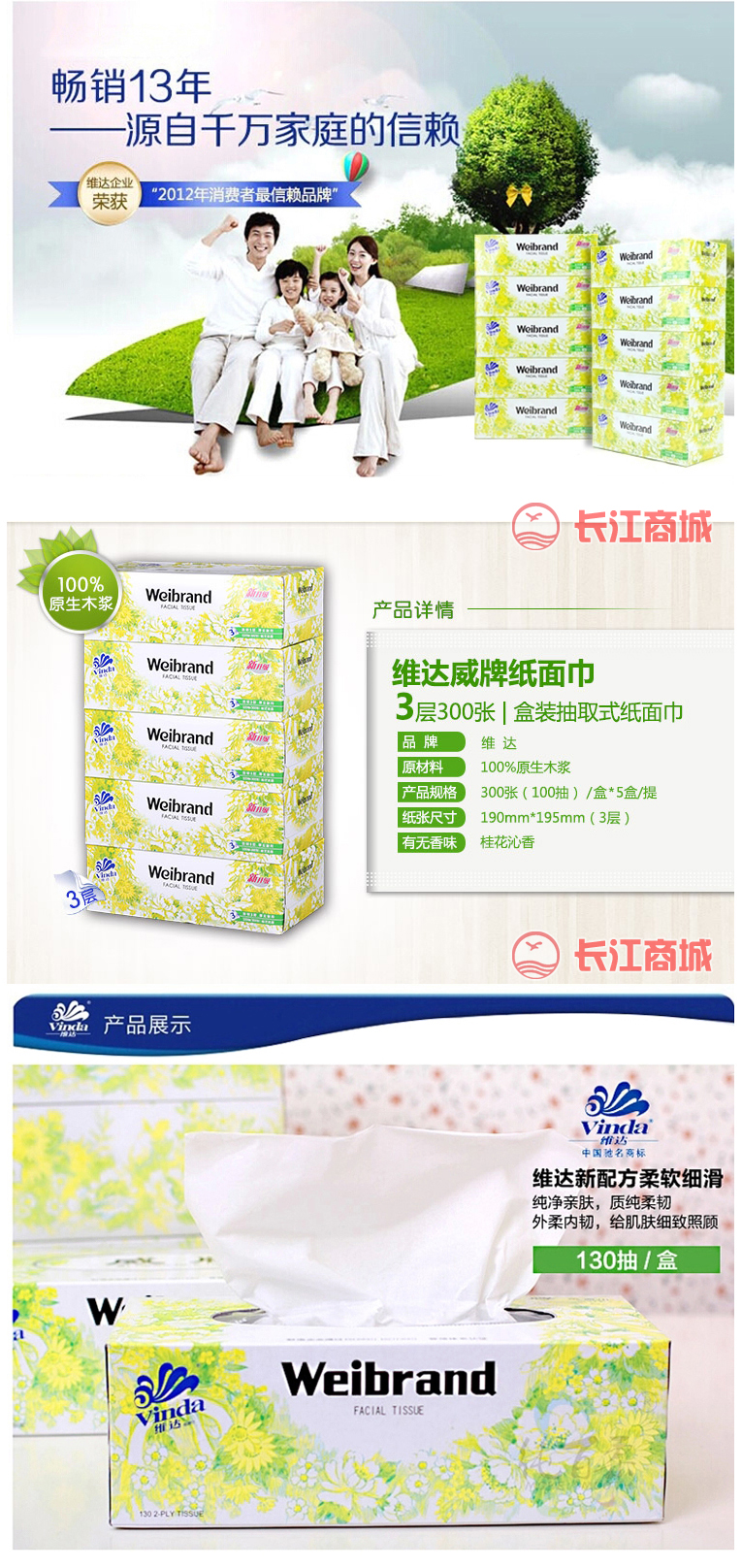原材料:100%原生木浆 规格:三层(300张)100抽 包装:5盒/提