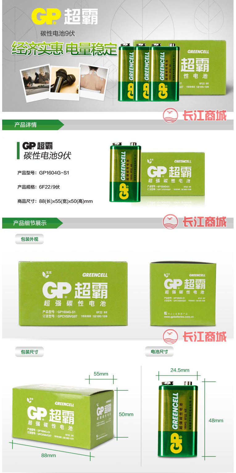 品牌:GP/超霸 类别:碳性电池 规格:6F22 / 9V 型号:GP1604G-S1 包装:10粒/盒