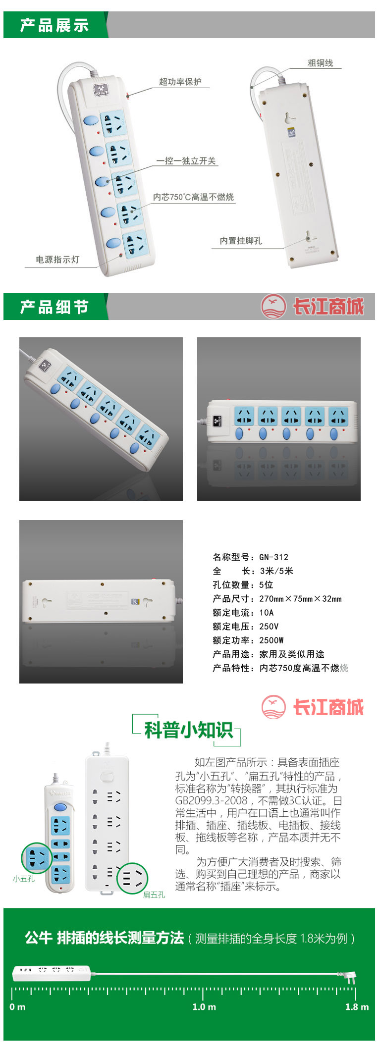 品牌:BULL/公牛 型号:GN-312 类别:家用插座 全长:3米/5米 插孔数:5位 额定电流:10A