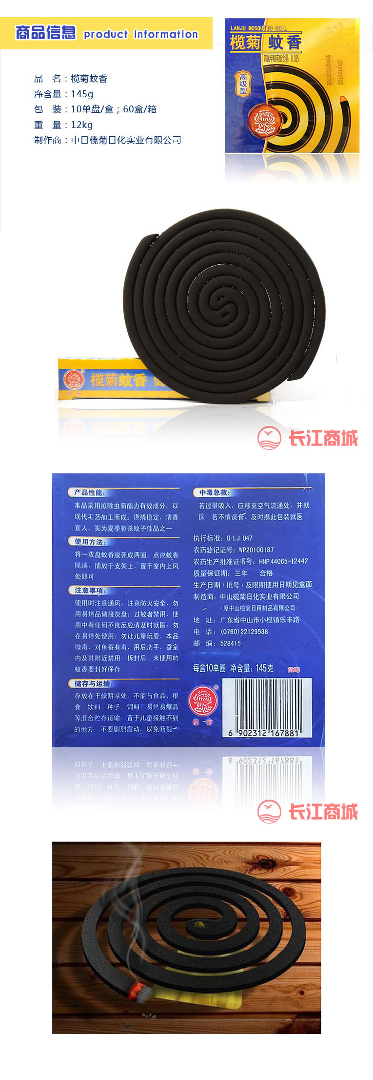 品牌:榄菊 品名:蚊香 净含量:145g 包装规格:10单盘/盒;60盒/箱