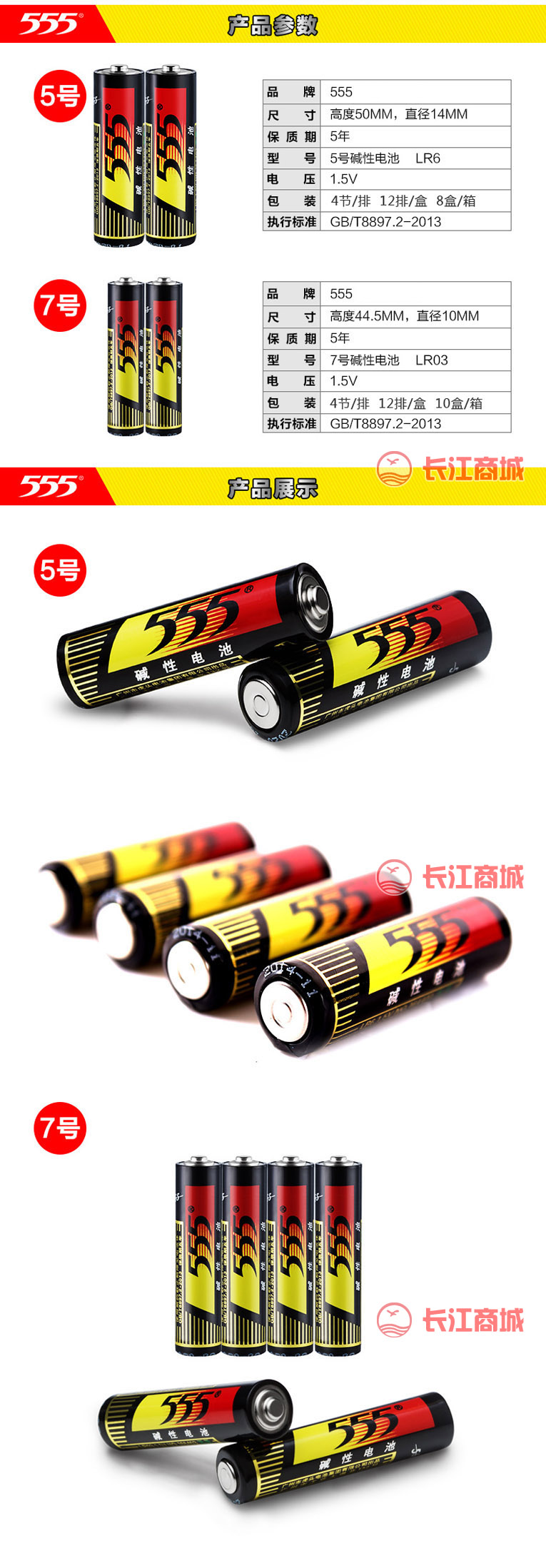 品牌:555 型号:5号 LR6 / 7号 LR03 类别:碱性电池 电压:1.5V 包装:4节/排;12排/盒