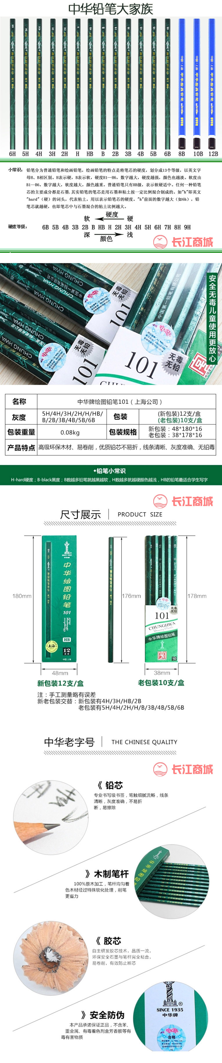 品牌:上海中华牌 型号:2B 品名:101绘图铅笔 包装:新包装12支/盒;旧包装10支/盒