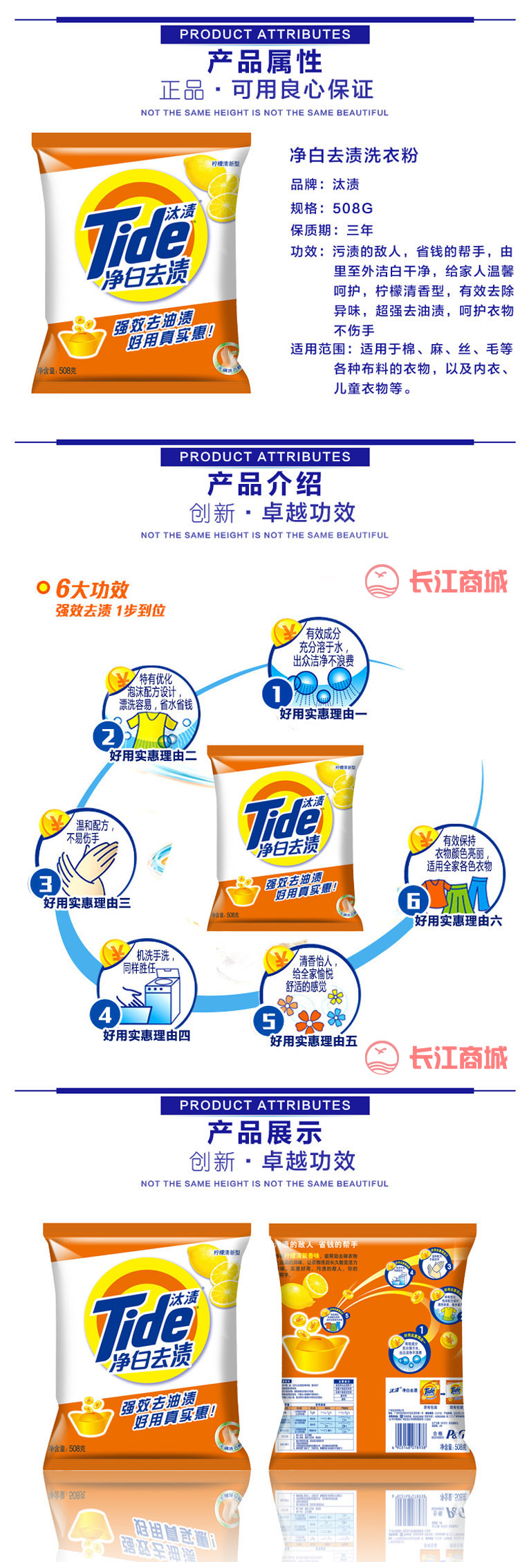 品牌:Tide/汰渍 品名:净白去渍洗衣粉 净含量:508g 香味:加香型/柠檬清香型(随机) 包装:12包/袋