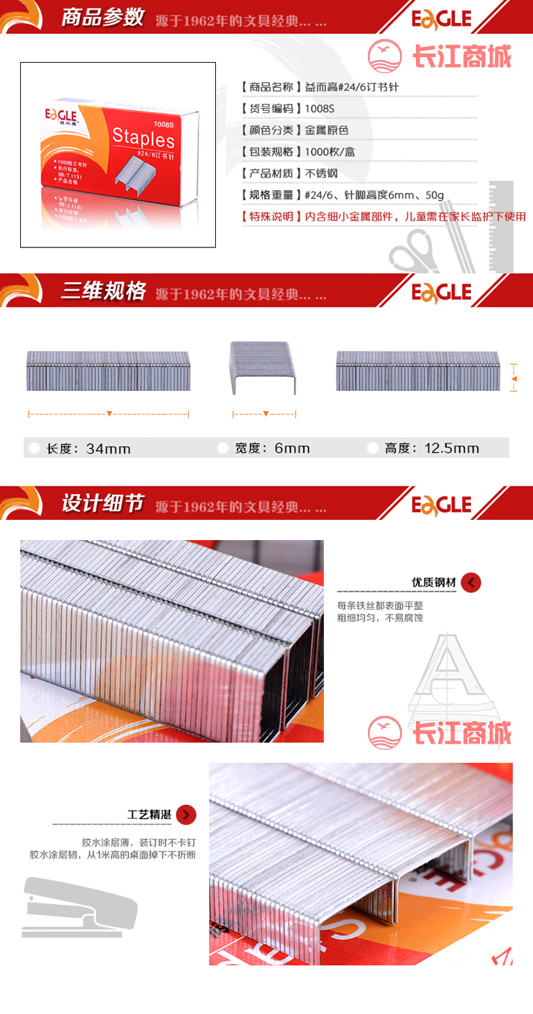 品牌:益而高 型号:1008s 类别:24/6订书钉 材质:不锈钢 包装:1000枚/盒;12盒/条