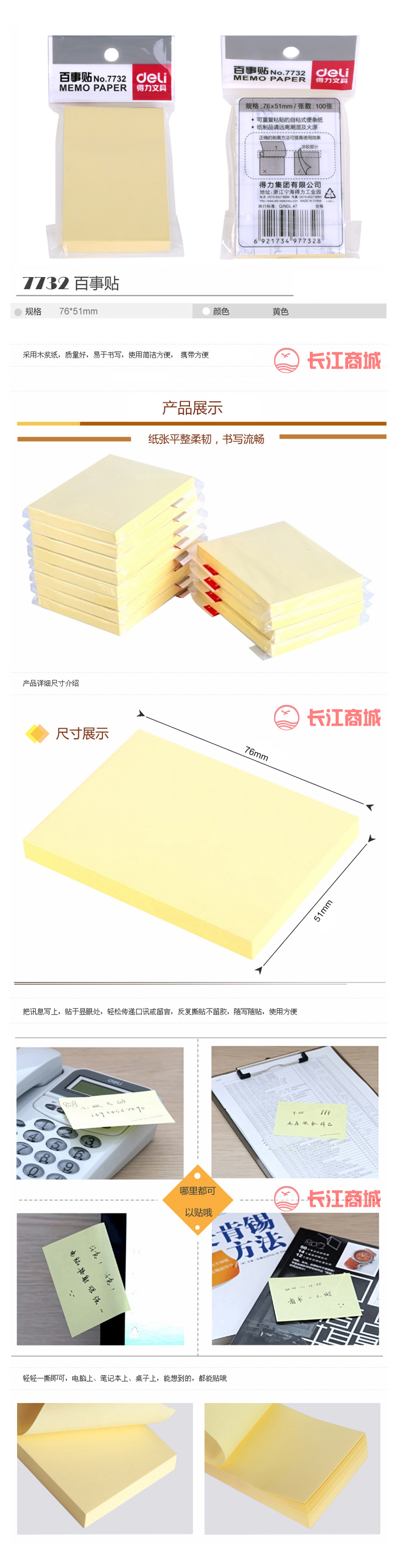品牌:deli/得力 型号:7732 类别:百事贴/告示贴/即时贴 颜色:黄色 规格:76x51mm 包装:100张/包