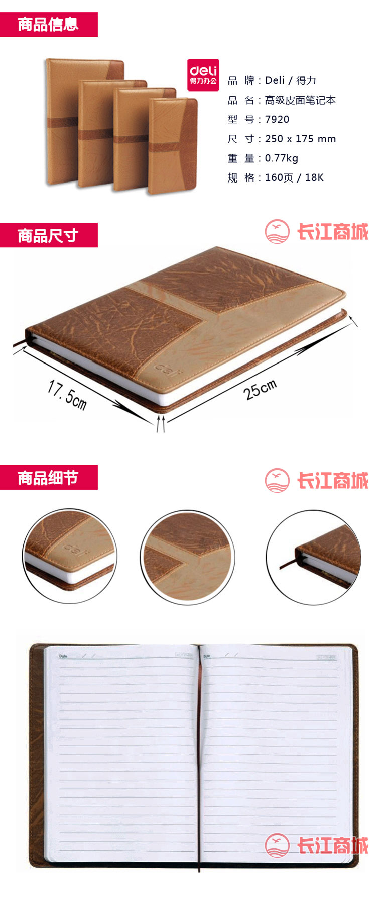 品牌:Deli/得力 型号:7920 品名:高级皮面笔记本 规格:160页/18K 尺寸:250 x 175 mm