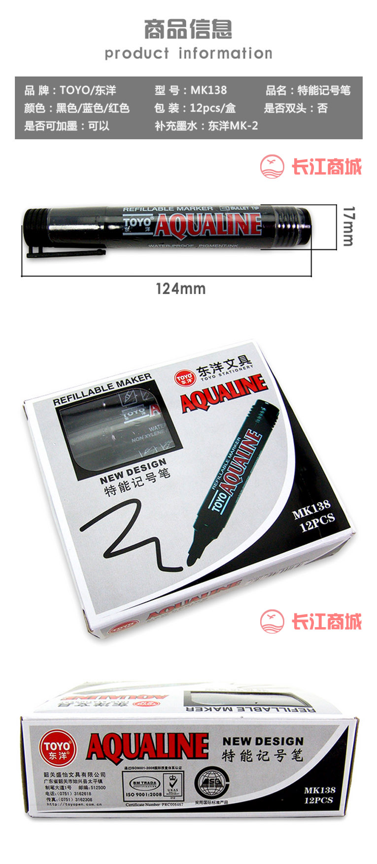 品牌:TOYO/东洋 型号:MK138 品名:特能记号笔/油性笔 是否可擦:否 包装:12pcs/盒